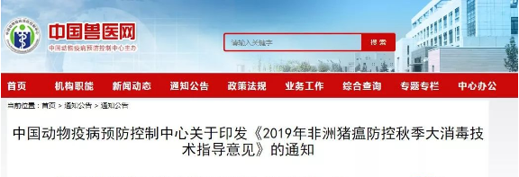 2019年10月22日,中國動(dòng)物疫病預(yù)防控制中心為做好全國秋季“大清洗、大消毒”專項(xiàng)行動(dòng),起草了《2019年非洲豬瘟防控秋季大消毒技術(shù)指導(dǎo)意見》,指導(dǎo)養(yǎng)殖企業(yè)的秋季消毒工作。