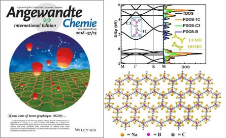 該研究組研發(fā)、制備了一類新型的硼代石墨炔,并通過(guò)理論計(jì)算與器件性能表征相結(jié)合的方式對(duì)其能帶結(jié)構(gòu)、電化學(xué)性能及儲(chǔ)鈉機(jī)制進(jìn)行深入分析。通過(guò)理論計(jì)算,研究了硼代石墨炔材料的能級(jí)在炔鍵(sp碳)與中心雜原子(B)上的分布情況,并進(jìn)一步分析該類材料能級(jí)結(jié)構(gòu)與在實(shí)驗(yàn)中所展現(xiàn)的輸運(yùn)性能之間的關(guān)系。通過(guò)對(duì)硼代石墨炔雙層排列構(gòu)型的理論分析結(jié)果與實(shí)驗(yàn)中獲得XRD散射角及分子孔道孔徑與分布情況相結(jié)合,探討了硼代石墨炔分子結(jié)構(gòu)與分子平面堆積方式,以及孔徑結(jié)構(gòu)之間的內(nèi)在聯(lián)系。研究發(fā)現(xiàn),硼代石墨炔對(duì)鈉原子特殊的化學(xué)吸附作用,可以獲得極高的理論儲(chǔ)鈉容量。器件測(cè)試結(jié)果也證實(shí)以硼代石墨炔為電極材料的鈉離子電池,具有優(yōu)異的綜合性能,充分顯示了該類材料在鈉離子電池器件中具備很強(qiáng)的應(yīng)用潛力,開(kāi)創(chuàng)了新型儲(chǔ)能器件電極材料研究的新方向。相關(guān)研究成果被選為VIP文章發(fā)表在《德國(guó)應(yīng)用化學(xué)》上。