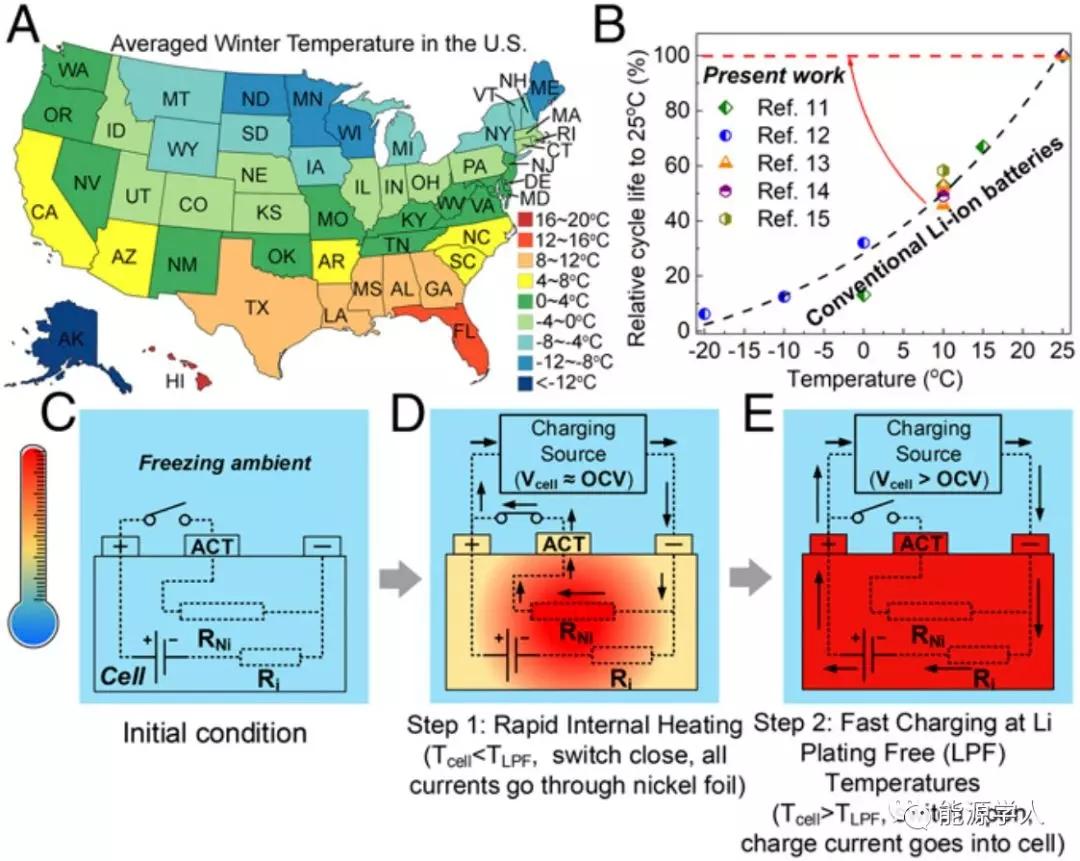 圖1. 實(shí)現(xiàn)不受溫度影響的快速充電基本思路。A) 美國各個(gè)州的冬季平均氣溫;B) 現(xiàn)有文獻(xiàn)中,不同溫度下循環(huán)壽命的相關(guān)數(shù)據(jù)(以25 ºC進(jìn)行歸一化處理);C-E) 用于無鋰沉積電池的快速充電可控單元結(jié)構(gòu)的原理示意圖。