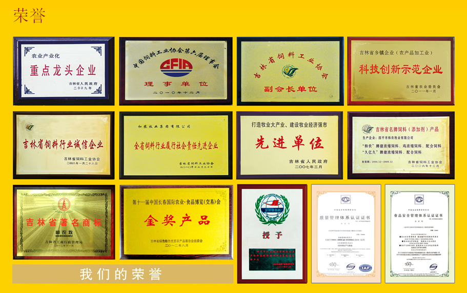 集團(tuán)先后被評(píng)為吉林省農(nóng)業(yè)產(chǎn)業(yè)化重點(diǎn)龍頭企業(yè)、牧業(yè)生產(chǎn)先進(jìn)企業(yè)、吉林省飼料行業(yè)誠(chéng)信企業(yè)、吉林省科技創(chuàng)新示范企業(yè)、吉林省科技創(chuàng)新先進(jìn)企業(yè)、吉林省飼料協(xié)會(huì)會(huì)長(zhǎng)單位、中國(guó)飼料工業(yè)協(xié)會(huì)理事單位,“和農(nóng)”品牌榮獲“吉林省名牌飼料產(chǎn)品”與“吉林名牌”稱(chēng)號(hào)、吉林省著名商標(biāo)。創(chuàng)業(yè)先后通過(guò)了“ISO9001:2008質(zhì)量管理認(rèn)證”和“HACCP食品安全認(rèn)證和農(nóng)乳豬奶料、保育豬配合飼料、蛋王飼料連年榮獲中國(guó)農(nóng)業(yè)食品博覽會(huì)金獎(jiǎng)。